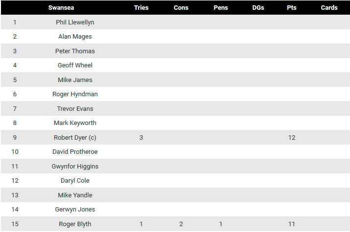 But dashing Dyer only just edged top spot in the scoring stakes, second place being filled a point behind by full-back Roger Blyth who harvested the remainder of Swansea’s points with a try, two conversions and a penalty goal.