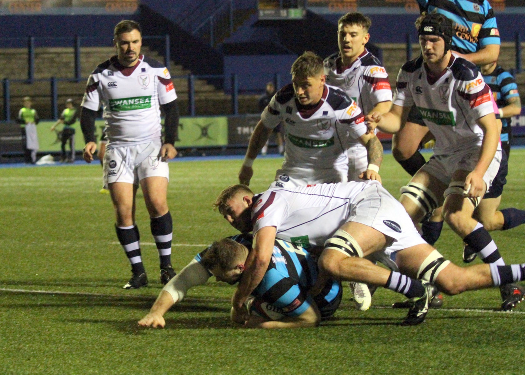 A long penalty touch finder by fly half Gareth Thompson earned the Blue and Blacks a lineout a few metres out. Hooker Joey Tomlinson’s throw was originally too high and the Swansea defence gathered possession, but a mistake gifted number eight Morgan Allen a simple try, which was confirmed by TV match official Tim Hayes. Thompson converted.