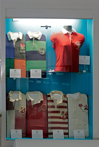 Rugby in Wales as elsewhere, is gradually regaining its momentum and, as we slip back into those familiar and much loved Saturday afternoon routines, we thought we’d recommence our tour of the St Helen’s Archive by highlighting one of the most recently completed displays of 2021. The two refurbished displays on the landing were the final sets to receive attention prior to the club reopening. The ‘Commemorative Jerseys Display’ is one that has been on the ‘to do’ list for some time and the emptying of the alcove nearest the St Helen’s Lounge finally gave us the free space to show a set of jerseys that marked significant events in rugby history. If we take these seven jerseys in chronological order, they cover a period from 1923 to 1981. Information cards next to each item give more information on the jersey and its owner. But let us begin by having a look at the earliest.