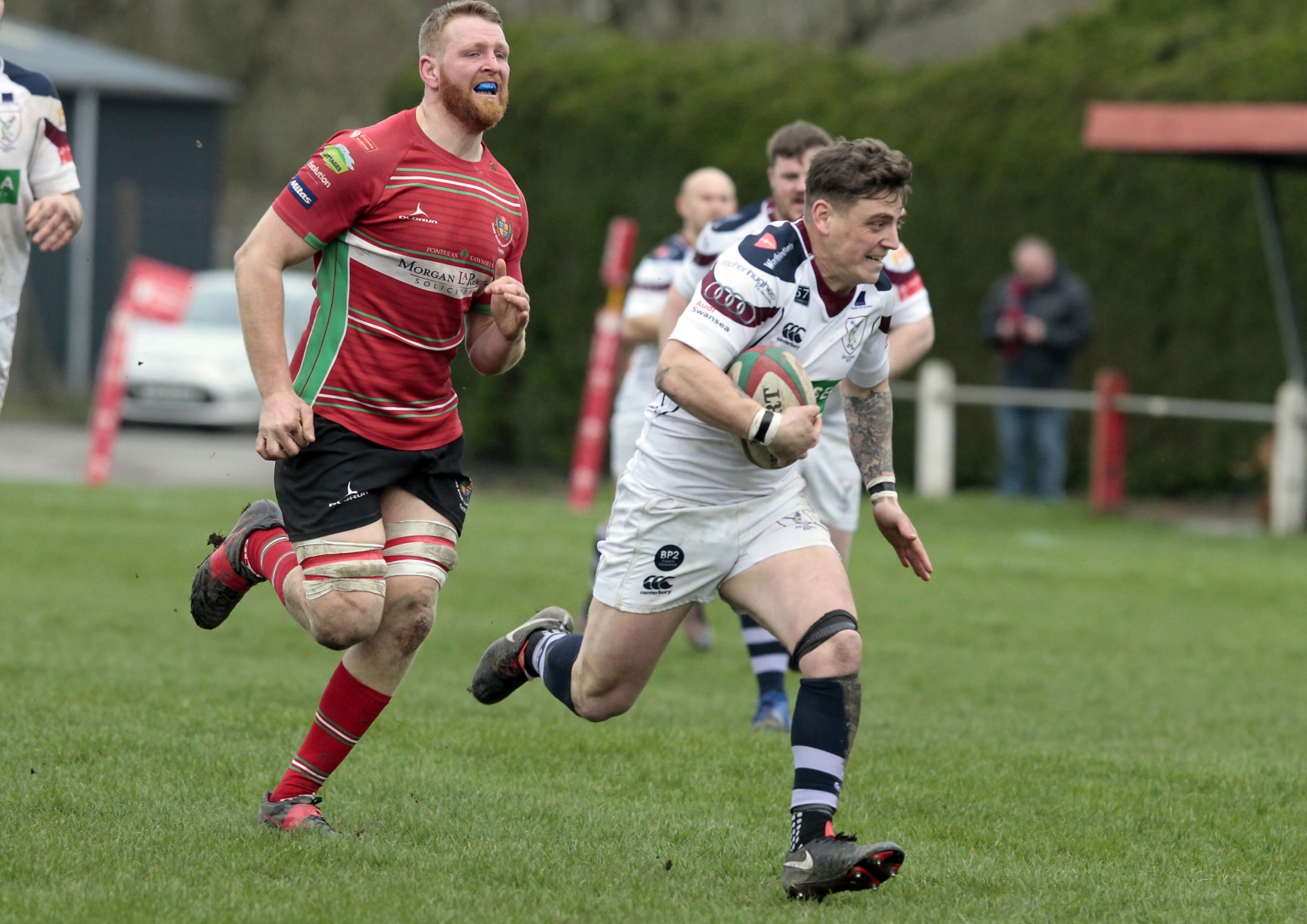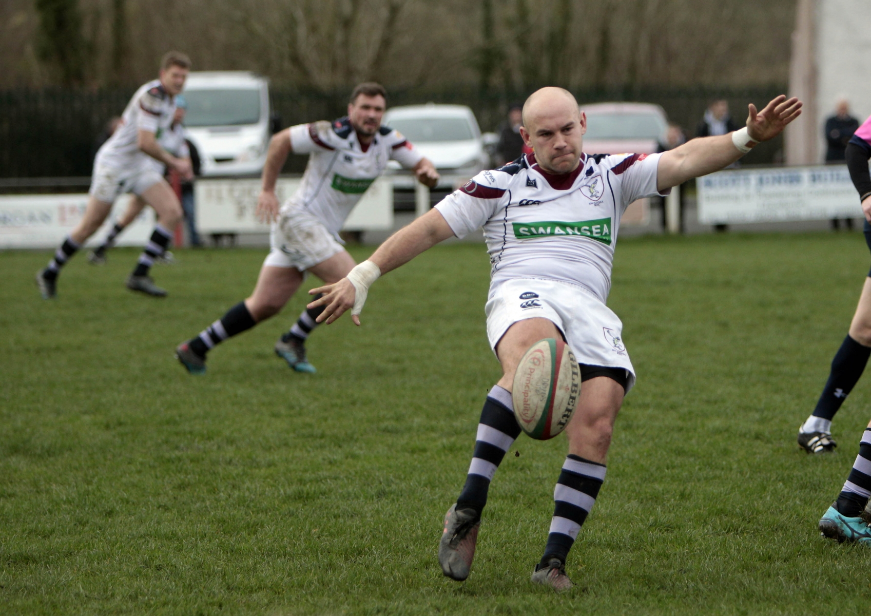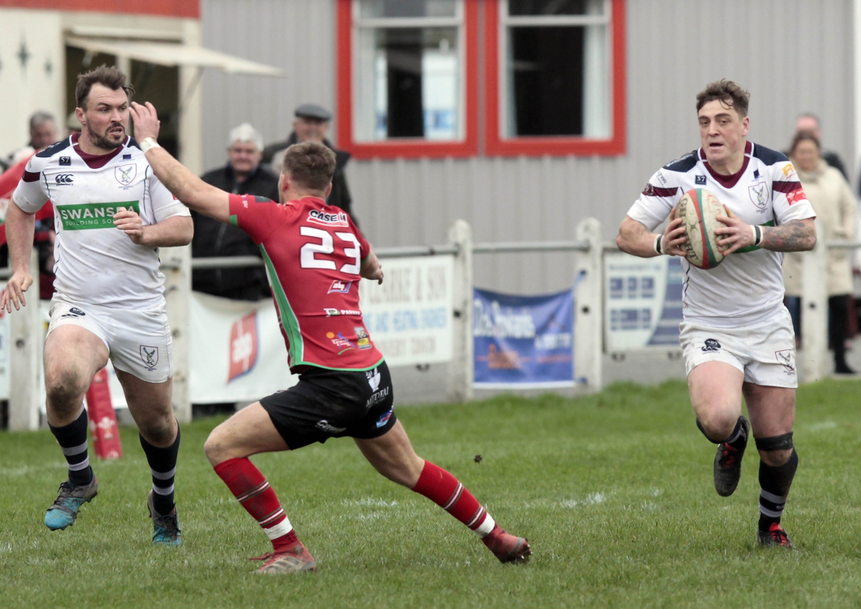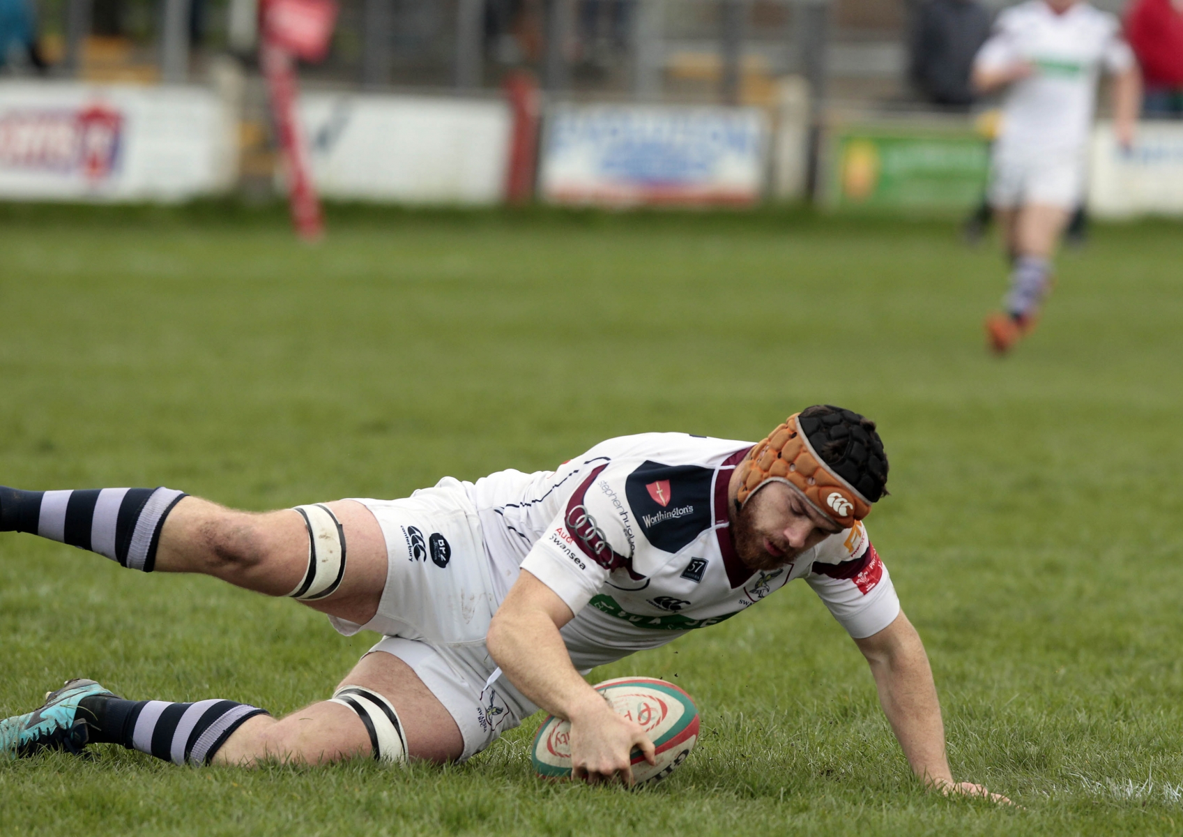 Morris burst through a tackle and found Steffen Williams, who sprinted up to the twenty-two, before flanker Stuart Worrall made a try saving tackle. Play was brought back for a Swansea penalty though and Steffen Williams chipped to the corner.