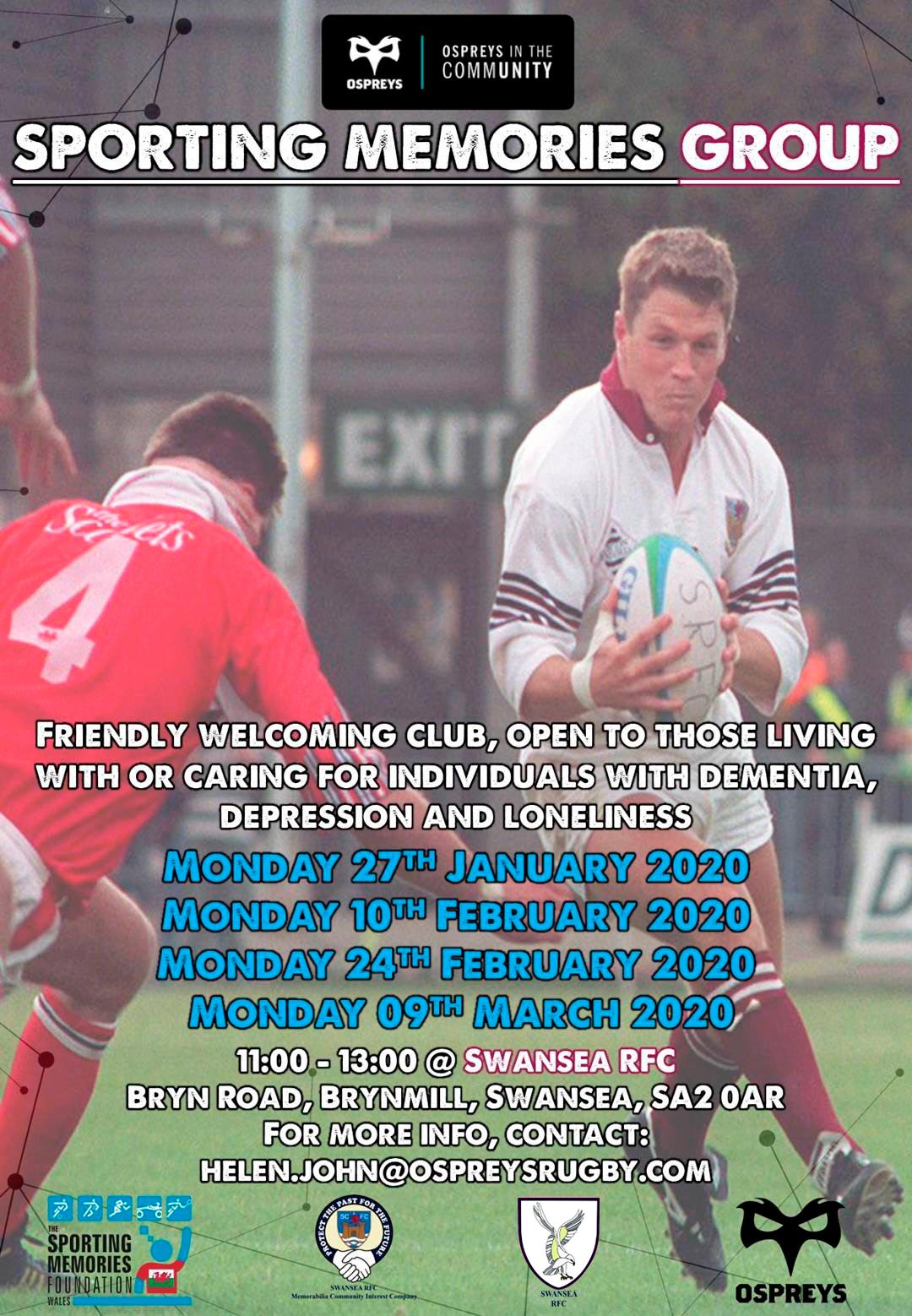 Ospreys in the Community are proud to launch their fourth Sporting Memories Club across the region which will be held at Swansea RFC beginning on Monday 27th January 2020. The club will be open to those of an older age group who are living with dementia, depression, loneliness and social isolation as well as their carers. In a friendly, welcoming environment we will provide individuals with the opportunity to chat, meet new friends, take part in activities and reminisce about sport. Using the proud history of Swansea RFC to start conversations and remember days gone by. Sessions and free and refreshments will be provided.