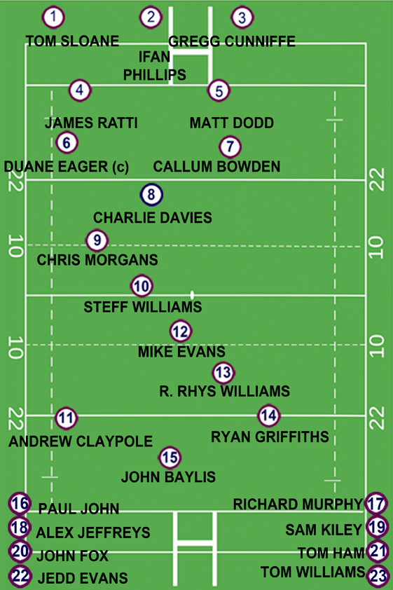 The forwards start the same as last weekend except that Ifan Phillips comes in at hooker. In the backline Mike Evans (centre) and John Baylis (full-back) come back into the side with Richard Murphy, Paul John and Tom Williams all coming onto the bench.