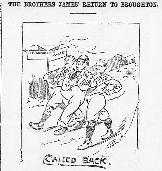 Cartoon depicting the brothers leaving Swansea for Broughton with a smile on their face. ‘The Brothers James Return to Broughton’, South Wales Daily Post, 26 January 1899, p.3