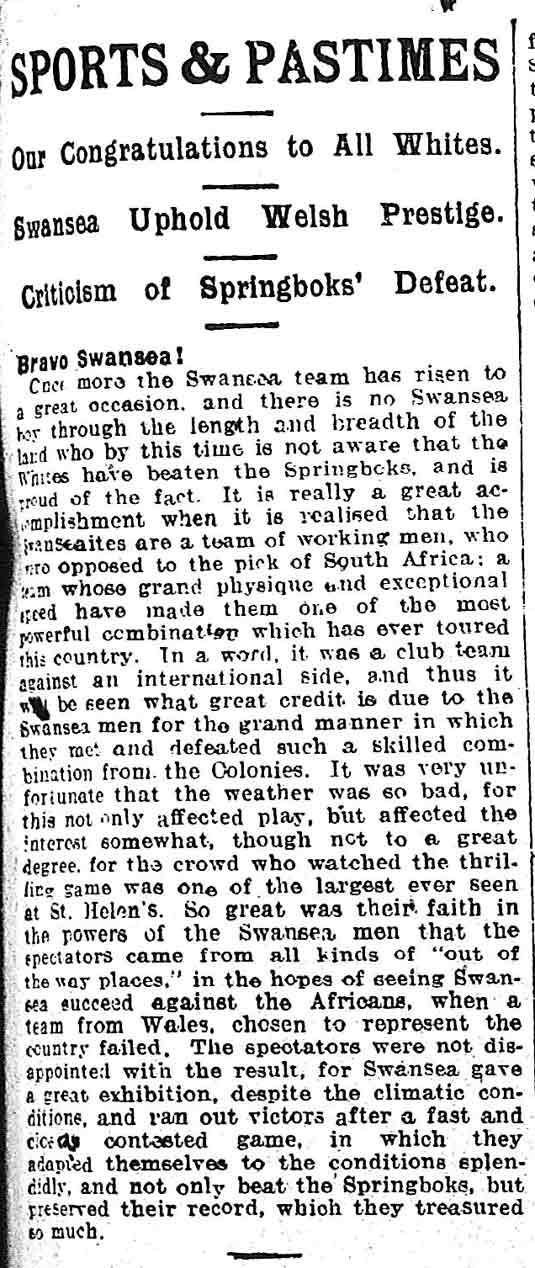 As well as defeating the South Africans that season, Swansea were able to maintain their form and were crowned Welsh club champions.