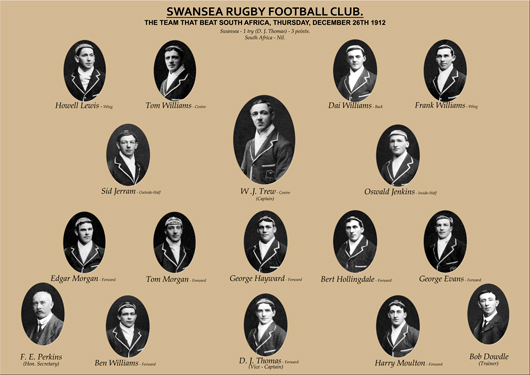 The Swansea team that defeated South Africa on Boxing Day 1912 – Collage speacially designed to mark the 100th anniversary of the victory in 2012-13 (Club Archive).