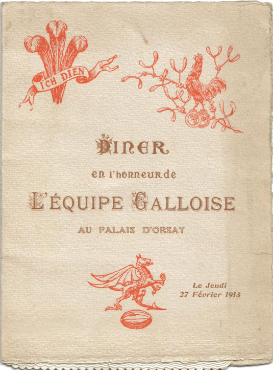 A dinner menu from the France v Wales match of February 27th 1913 which Wales won by 3 tries and 1 conversion to 2 tries and 1 conversion. Again Billy Trew captained the side and Howel Lewis and Rev. Alban Davies were joined by their Swansea team mate Tom Williams, gaining his second cap. (Courtesy: Ellis Rugby).