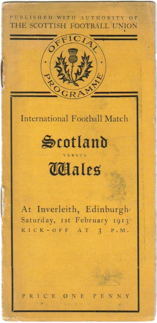 A match programme from the Scotland v Wales match on February 1st 1913 at Inverleith, Edinbugh. wales won by 2 tries and a conversion to nil. Billy Trew captained the side and was the only player in the Welsh side who’d previously played against Scotland. He was joined by Swansea team mates Howell Lewis and the Rev Alban Davies, both making their international debut. (Courtesy: Ellis Rugby).