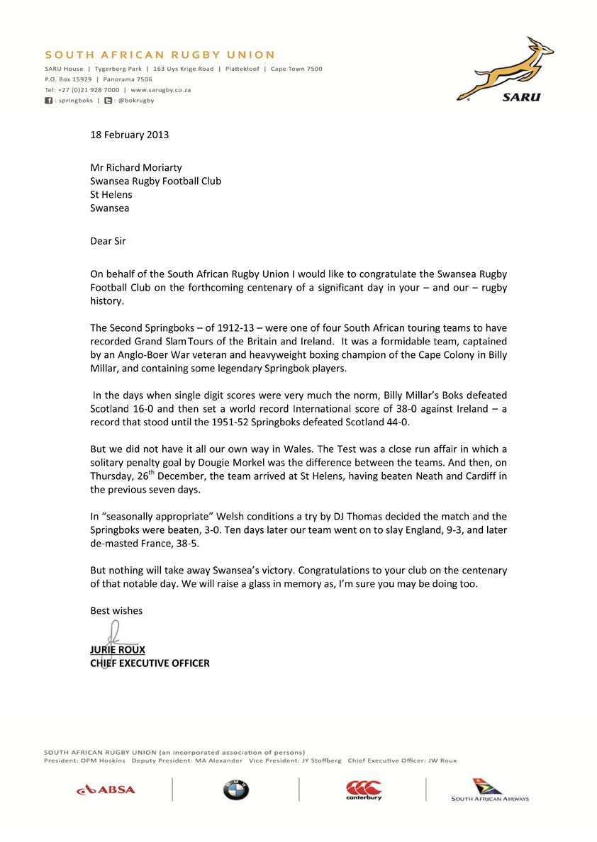 A letter received in February 2013 from the SARU commemorating the centenary of Swansea’s win over the 1912 Springboks. (Club Archive)