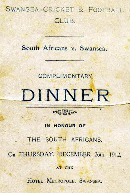 Above: A dinner menu from the post match function after Glamorgan played the 1912 Springboks (October 17th). The Springboks won emphatically by 2 goals, 1 dropped goal, 1 penalty goal and 6 tries to a single try. Bryn Lewis, Tom Williams and Tom Morgan represented the Swansea team in the Glamorgan side. (Courtesy: Ellis Rugby).
