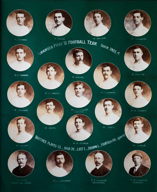 The Swansea RFC 1st XV team of 1903-04. The club ended up as champions for the 5th occasion in 6 seasons. The only defeat came at Newport in December. (Club Archive).