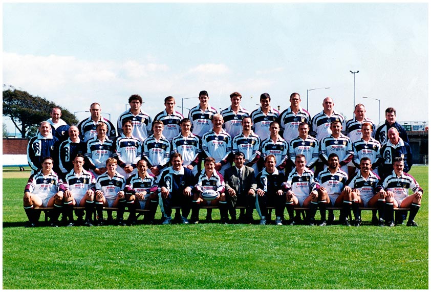Front Row(L to R): Darren Morris, Mark Taylor, Arwel Thomas, Simon Davies, John Plumtree (Director of Coaching), Scott Gibbs (Captain), Baden Evans (Director of Rugby), Kevin Hopkins (Coach), Dean Thomas, Colin Charvis, Matthew Back, Anthony Clement.