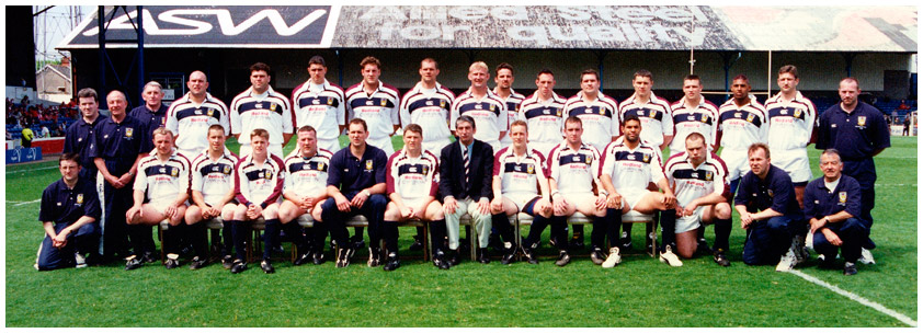 Front Row(L to R): Ian Chesterfield (Physio), Rhodri jones, David Weatherly, Arwel Thomas, Garin Jenkins, John Plumtree (Director of Coaching), Scott Gibbs (Captain), Baden Evans (Director of Rugby), Andy Booth, Dean Thomas, Colin Charvis, Chris Anthony, Kevin Hopkins (Coach), John Edwards.