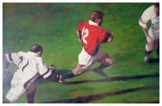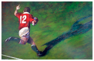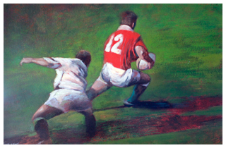 Set of three oil paintings by artist John Kent, celebrating Scott Gibbs’ famous try at Wembley on 11th April 1999 which Neil jenkins converted to give Wales a 32 – 31 win in the final Five Nations Championship. The win prevented an England Grand Slam. Scotland became Champions in consequence of the Wales win. The pictures are on display in the Main Bar at St Helens.