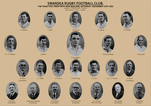 The highlight of the season featured a game against the touring New Zealand team on 12 December 1953. Swansea rose to the occasion magnificently in front of a partisan 40,000 crowd to secure an excellent 6-6 draw. Swansea’s points coming from the boot of 20 year old centre John Faull.