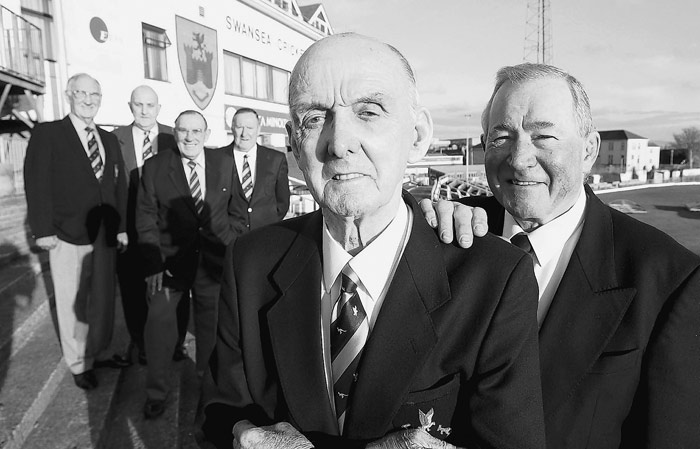 Surviving members of the team that drew 6 – 6 with the 1953 All Blacks photographed in 2006 outside the Swansea RFC pavilion. Back row left to right: Trevor Petherbridge, W.O.G. Williams, Horace Phillips, Jim Rees. Foreground skipper of the Swansea team Dil Johnson (left) and John Faull who kicked 6 points from inside his own half. – Courtesy Gayle Marsh SWEP.