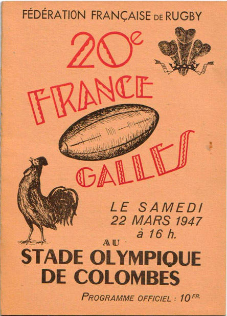 Programme from France v Wales international at Stade Olympique de Colombes, Paris 22 March 1946. Wales won 3 – 0 from a Bill Tamplin (Cardiff) penalty. Swansea’s D.C.J. Jones played in the pack. The captain was Haydn Tanner, now playing for Cardiff. (Courtesy Ellis Rugby).