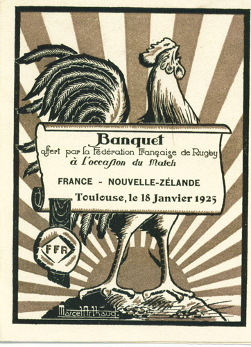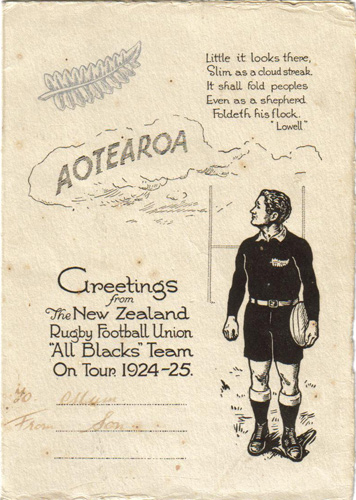 (Above left) A Christmas card specially designed for the All Blacks 1924-25 tour, to be sent home by players on the extended tour. (Above right) A souvenir from the post match banquet – New Zealand v France. The match against France was one of the last three games on the tour. It was played at Toulouse on 18th January 1925 and New Zealand were 30 – 6 winners (both items Courtesy: Ellis Rugby).