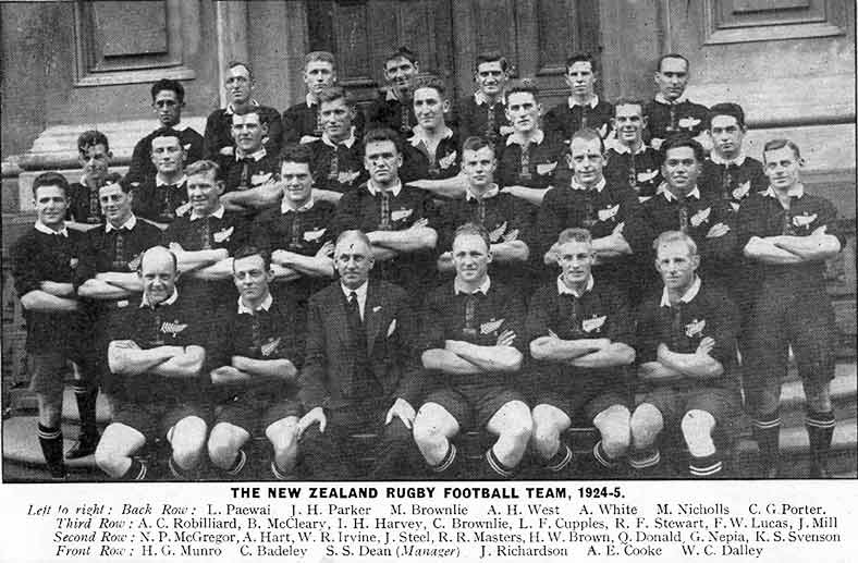 New Zealand – G Nepia, F W Lucas, J Steel, H W Brown, A E Cooke, M F Nicholls, W C Dalley, W R Irvine, Q Donald, C J Brownlie, I H Harvey, M J Brownlie, A H West, A White, C G Porter (captain).