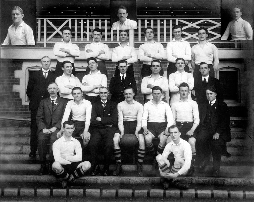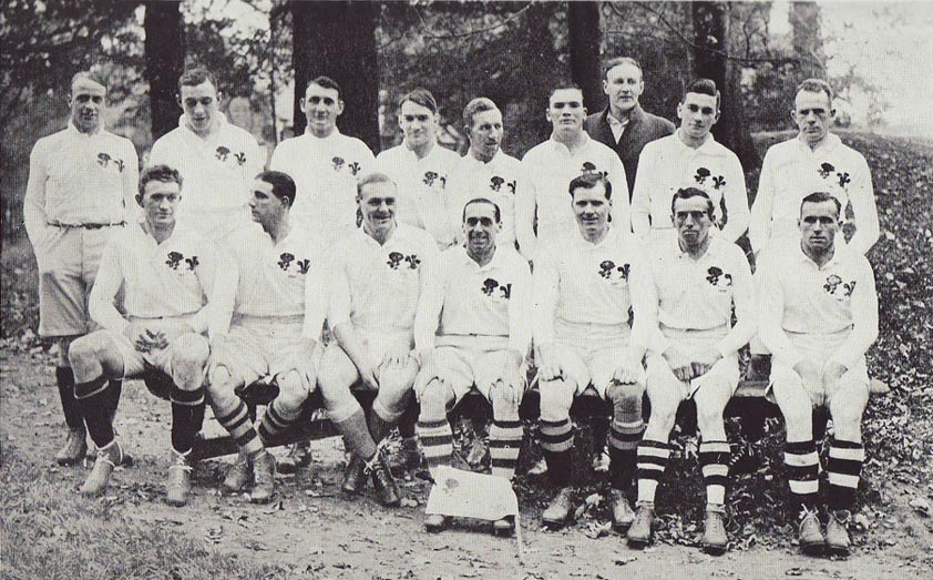 The England and Wales team that played Scotland and Ireland on 1st November 1923 in the Centenary Match at Rugby School. Swansea’s Rowe Harding and Gwilym Michael both played in the England & Wales team.