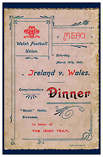 This is a dinner menu from the post match Dinner given by the Welsh Football Union to the Irish team and officials at the Royal Hotel in swansea. (Courtesy Ellis Rugby).