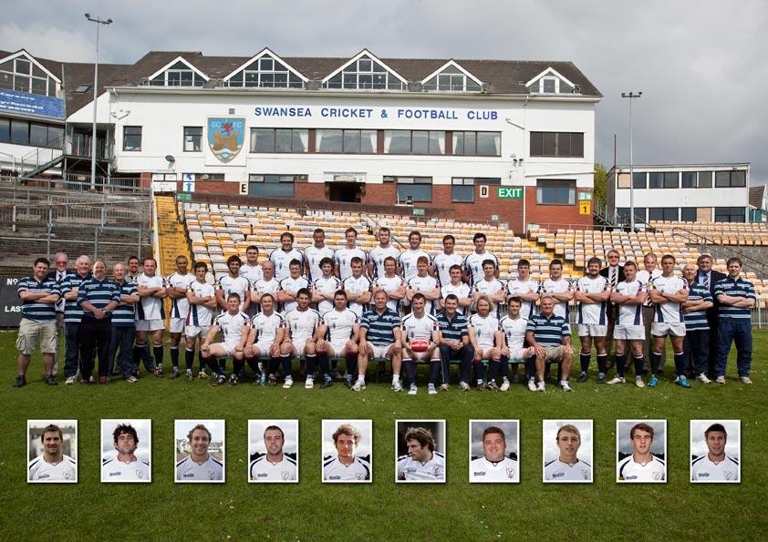 2nd Row(L to R): Andy Jones, Meirion Howells (Dir.), Roy Pascoe (kit), Andy Maggs (Physio), Tudor Jeremiah (kit), Rev. Pete Orphan (Chaplain), Andrew Clatworthy, Eli Walker, Matthew Morgan, Gareth Owen, Rory Pitman, Dai Watts, Leigh Bevan, Phil Tucker, Tom Morgan, Chris Shelmerdine, James Dixon, Alun Rees, Luke Hathaway, Sam Lewis, Matthew Davies, Roy Jones, Phil Llewellyn (Chairman), Rhys Jones, Dai Protheroe (Com.), Hanno Dirksen, Dai Roberts (kit Manager), Byron Mugford (Hon. Sec.), Marc Jones (Fitness Coach).