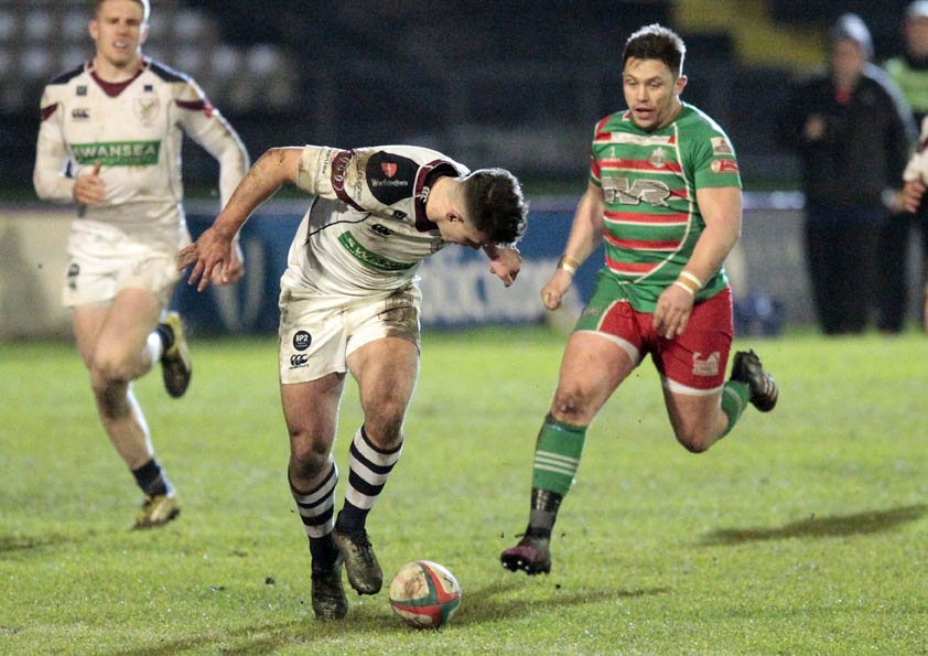 Ebbw winger Toby Fricker used his strength to power forward, but fellow winger Steff Thomas was penalised for diving on a Swansea defender when he attempted to run down a grubber kick.